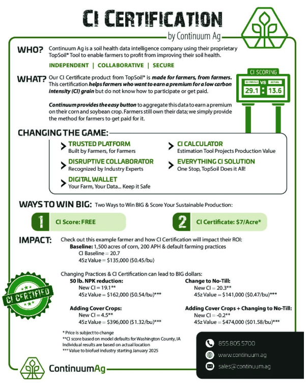 Carbon Intensity is Continuum Ag’s Suite of Services designed to help farmers quantify and monetize their data. This includes measuring the carbon footprint associated with producing agricultural products, such as a bushel of grain.